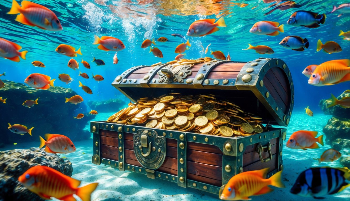 Pemandangan bawah laut dengan ikan warna-warni berenang di sekitar peti harta karun besar yang penuh dengan koin emas dan permata.